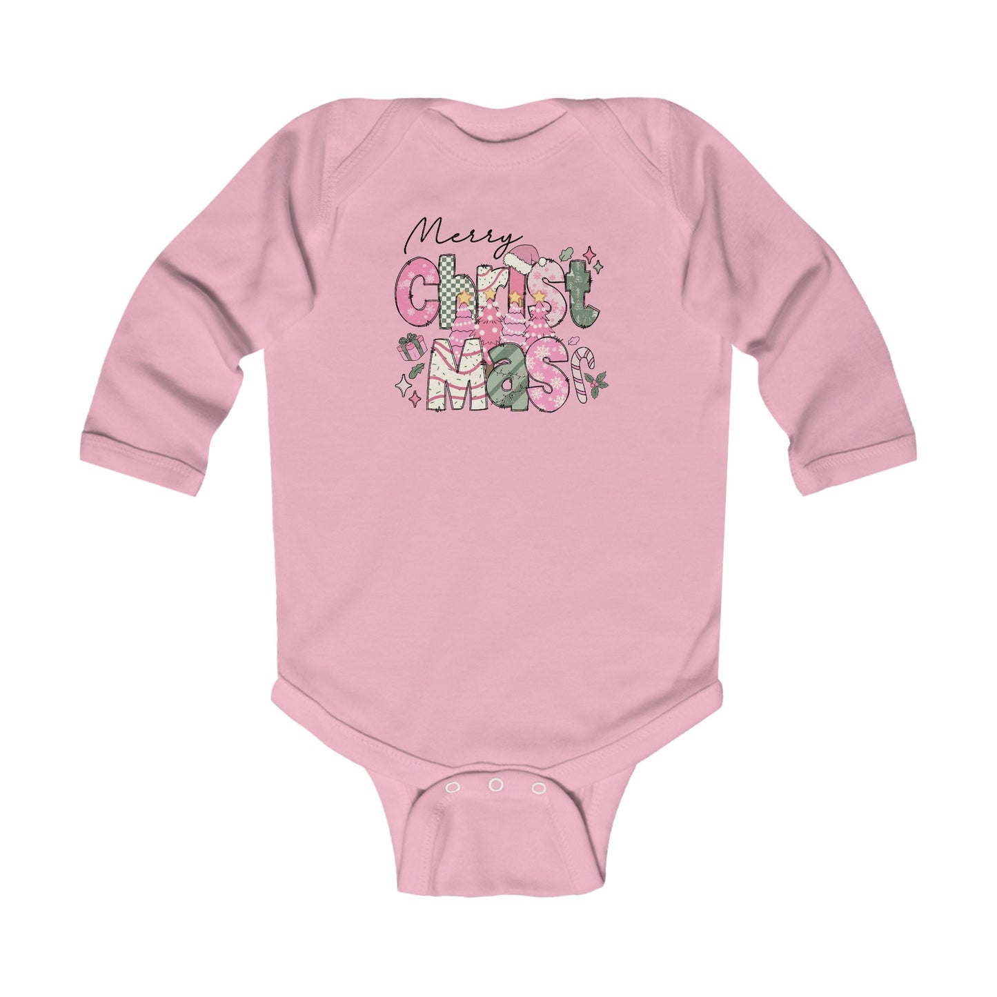 This Merry Christmas Infant Onesie is designed to hold up. Solid colors are 100% cotton, and other colors will include polyester. Either way, the fabric will be smooth and soft against the young one's skin. There are plastic snaps at the cross closure for easy changing. All bindings have ribbed knitting for durability and improved range of motion.